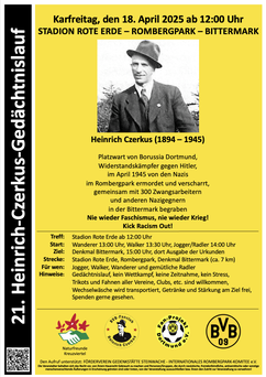 In Kooperation mit dem BVB Fanclub "Heinrich Czerkus" und dem Verein "Zweitzeugen e.V." gestalteten wir vom 07.04. - 11.04.2025 die Erinnerungsarbeit rund um den ehemaligen Platzwart von Borussia Dortmund. Heimrich Czerkus war Widerstandskämpfer gegen das NS-Regime und wurde im April 1945 von Nazis im Rombergpark ermordet. Die Ergebnisse der Themenwoche wurden beim alljährlichen Heinrich-Czerkus-Gedächtnislauf am Karfreitag 2025 präsentiert.